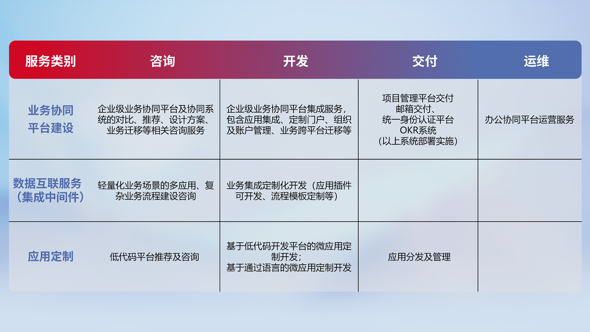针对钉钉、、企微、、、IDaas等平台级产品提供产品的规划、、、、方案、、、交付、、、、定制化开发等服务,,,实现如统一协同办公、、、、智能客户服务、、混合会议管理、、、、智能数据查询、、、、等业务场景,,实现数字化转型。。。。