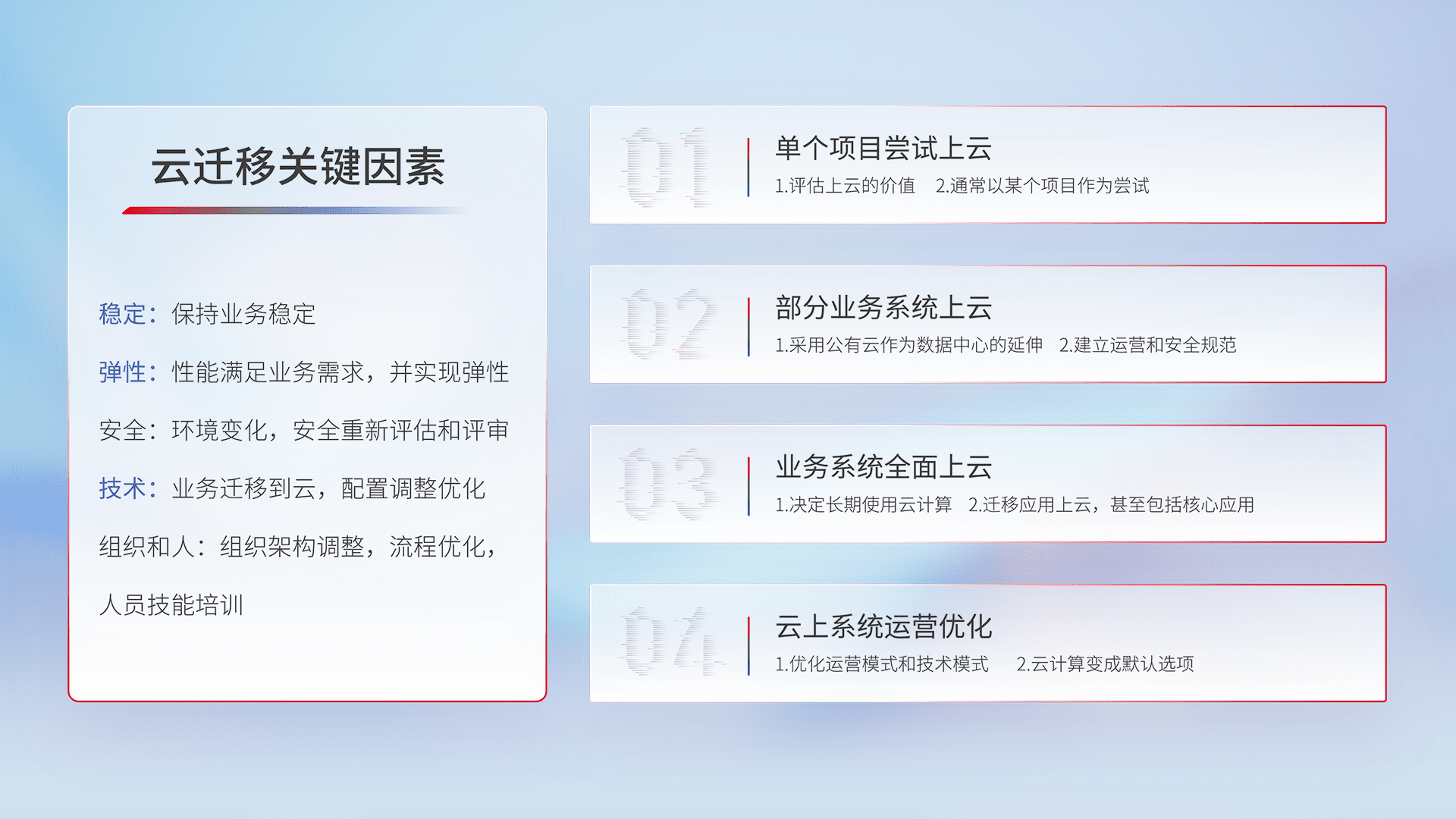结合实际业务,,,从规划设计、、、云平台选型、、云原生改造、、、数据迁移、、集成交付,,迁移全过程为客户识别最佳上云路径,,,做好风险识别管理,,,设计网络架构、、身份权限、、安全审计合规、、、操作审计、、、日志审计、、监控告警策略、、、、多站点容灾设计等,,,对云上基础设施进行整体规划,,,,提升IT治理水平,,以满足弹性、、、高可用、、、高性能的需求。。。。